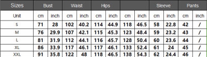 | Size | Bust | Waist | Hips |