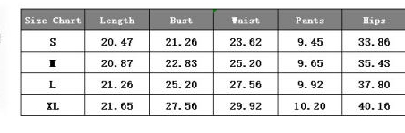 | Size | Bust | Waist | Hips |